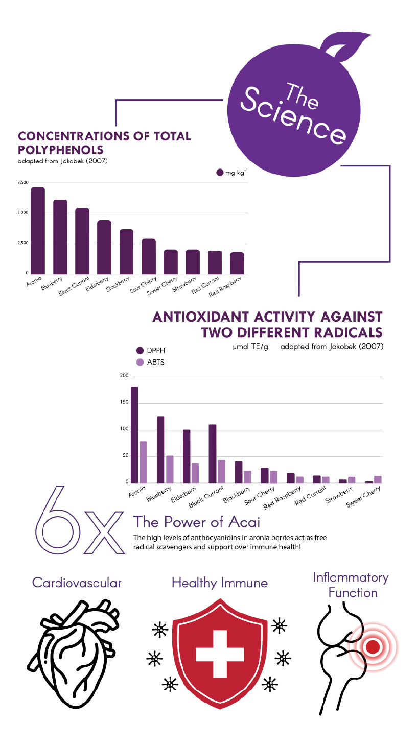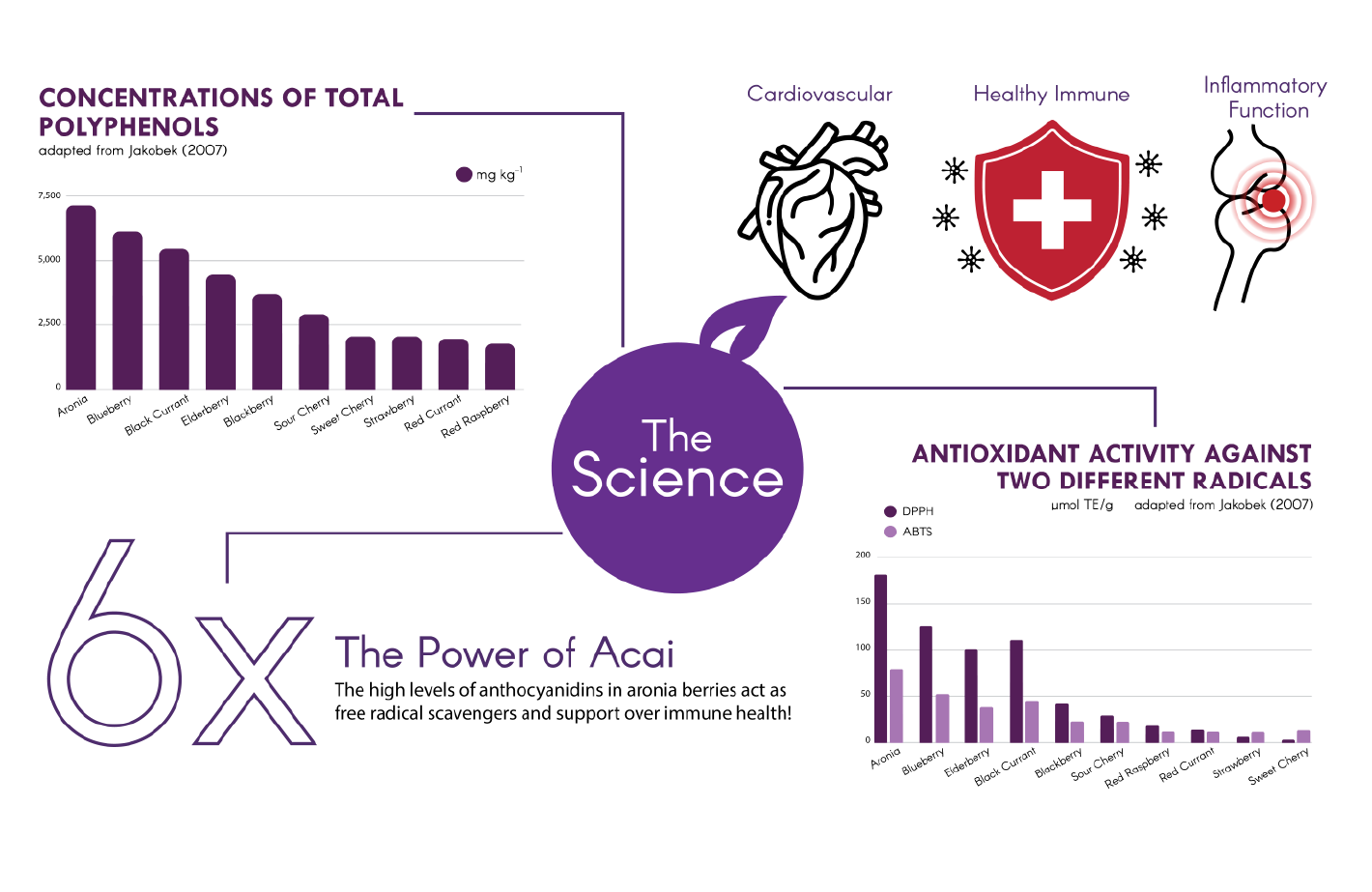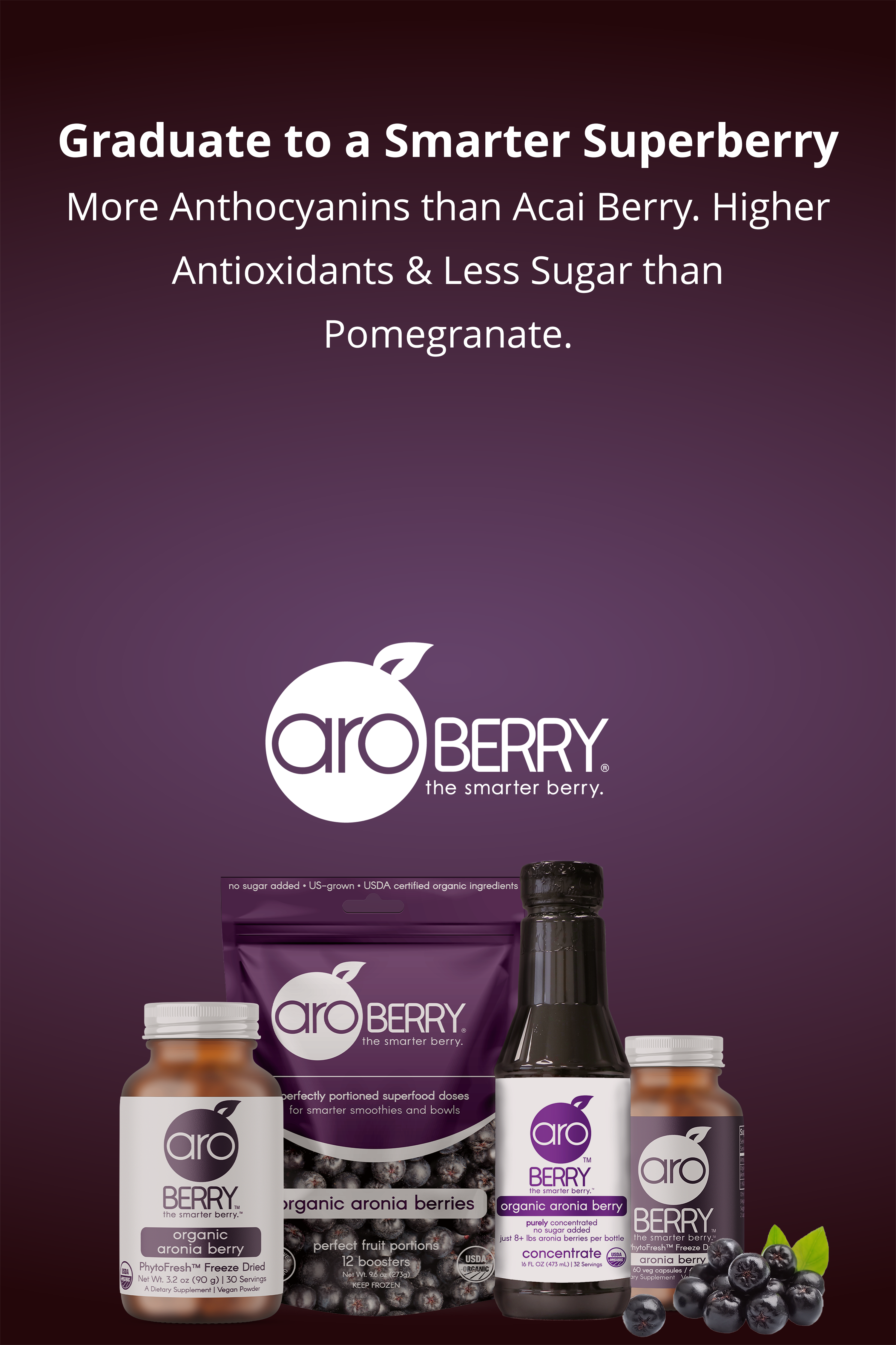 US Grown, Organic and Never Imported: our variety of Aronia Berry, propagated from America’s first aronia berry farm, is the most sought after of all the dark pigmented super berries. Virtually all of the health-related research on the aronia berry has been conducted on this true to type aronia berry cultivar. Known for its characteristic vibrant purple-black color and distinctive tart-tanic flavor profile, coupled with the highest superfruit antioxidant activity and anthocyanin content, our single-origin, organic aronia berry truly is The Smarter Berry.